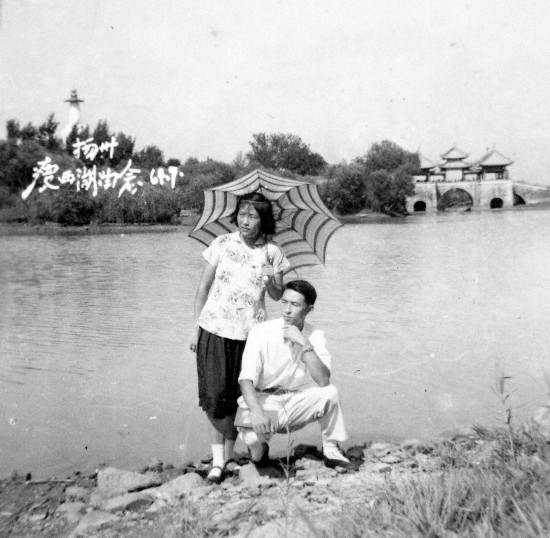 对瘦西湖,希韵的父亲一直都有很深的情结。他年轻时当过老师,上过军校,后转业回家在教育部门工作。“父亲一生酷爱学习,做什么事都极其认真,他年轻时经常带着书本去瘦西湖阅读。”1960年4月,他骑着自行车在五亭桥边上拍了一张照片留影。后来,经人介绍,他与靖江的母亲相识、相恋。1961年7月,恋爱中的父母去瘦西湖玩留影。“母亲打着时尚的花伞,父亲半蹲着,他们相偎相依,远处有五亭桥和白塔。”希韵介绍。
