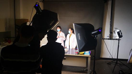 成蒙(左一)和博士生汤建在录制科普视频。受访者供图