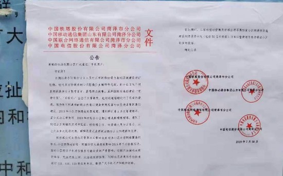 张贴在怡海花园小区的公告,盖着中国铁塔股份有限公司菏泽分公司(以下简称:铁塔分公司)及三大电信运营商的红章,落款时间为7月20日。