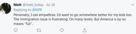 同样身为家长的网友“Matt”称:“就我个人而言,我能理解(她)。我也想把我的孩子带去一个更好的地方。在很多层面上讲。移民问题都令人沮丧。但美国绝不是‘满了’。”