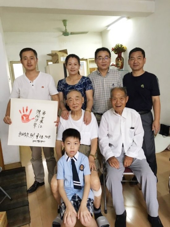 李臣星(手持手印者)和两位老兵及其后代一起合影