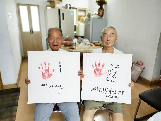 “我听说后非常激动,一定要赶来见证两位老兵的重逢。”仪征红色民间收藏家李臣星,从去年起就与时间赛跑,寻找抗战老兵,留下他们的红色印记,得知两位老人重逢,专门从仪征一同赶来,要采集两位老人的手印。