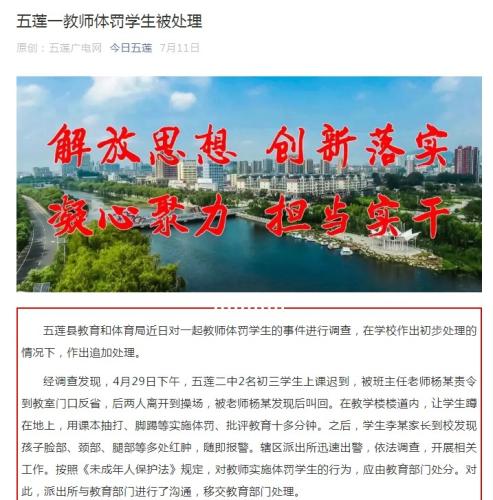 7月11日,五莲县信息中心微信公众号“今日五莲”发布了该事件的详细介绍,称五莲县教育和体育局对该教师体罚学生的事件进行调查,在学校作出初步处理的情况下,作出追加处理。