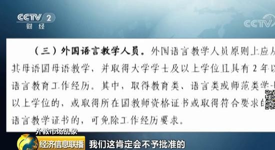 国家外国专家局工作人员:外语教学人员原则上得是母语国的,所以说非母语国家的外教要正常在网上提交的话,我们这肯定会不予批准的。因为政策上是这么写的。
