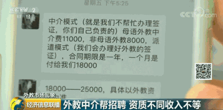 记者在调查中发现,还有外教中介公司给培训机构专门联络外教资源,资质不同,价格不等。中介工作人员介绍,来自英语国家、持有文教类工作签证的外教,月薪普遍在两万元以上;如果是母语非英语、持有学生签证的外教,月薪则在一万元左右。