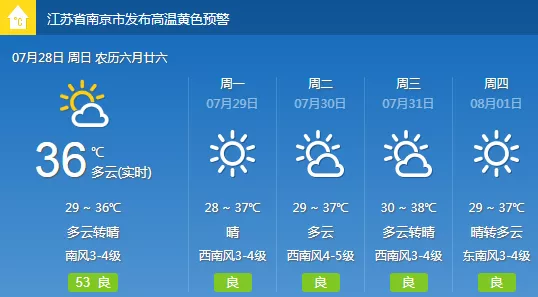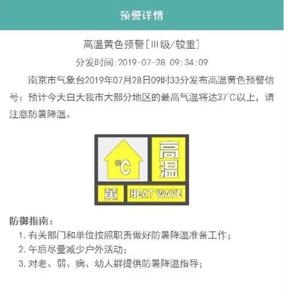 今天09时33分,南京气象台发布今年第三个高温黄色预警信号:预计今天白天南京市大部分地区的最高气温将达37℃以上,请注意防暑降温。