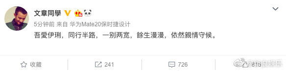 7月28日14点53分 ,文章宣布与马伊琍离婚:“吾愛伊琍,同行半路,一别两宽,餘生漫漫,依然親情守候。”