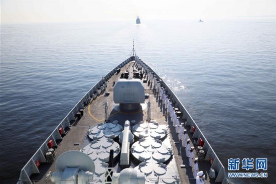 中国人民解放军海军导弹驱逐舰西安舰受邀参加了海上阅兵。西安舰官兵们身着白色礼服,在甲板上整齐列队。