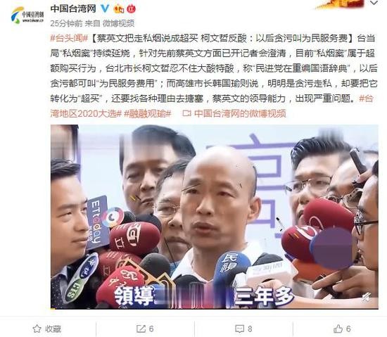 台当局“私烟案”持续延烧,针对先前蔡英文方面已开记者会澄清,目前“私烟案”属于超额购买行为,台北市长柯文哲忍不住大酸特酸,称“民进党在重编国语辞典”,以后贪污都可叫“为民服务费用”;而高雄市长韩国瑜则说,明明是贪污走私,却要把它转化为“超买”,还要找各种理由去搪塞,蔡英文的领导能力,出现严重问题。