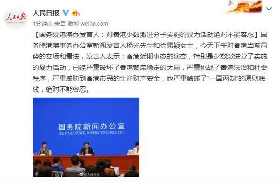 国务院港澳事务办公室新闻发言人杨光先生和徐露颖女士,今天下午对香港当前局势的立场和看法,发言人表示:香港近期事态的演变,特别是少数激进分子实施的暴力活动,已经严重破坏了香港繁荣稳定的大局,严重挑战了香港法治和社会秩序,严重威胁到香港市民的生命财产安全,也严重触碰了“一国两制”的原则底线,绝对不能容忍。