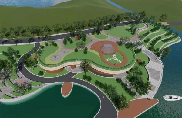 结合园区的南北地势差异,绿色活力基地将采用地景式建筑的形态来呈现。游客可以通过环湖路,沿着台阶进入展厅,也可以从环湖路进入建筑的屋顶,屋顶上布置了大量的绿植,便于游客观景。