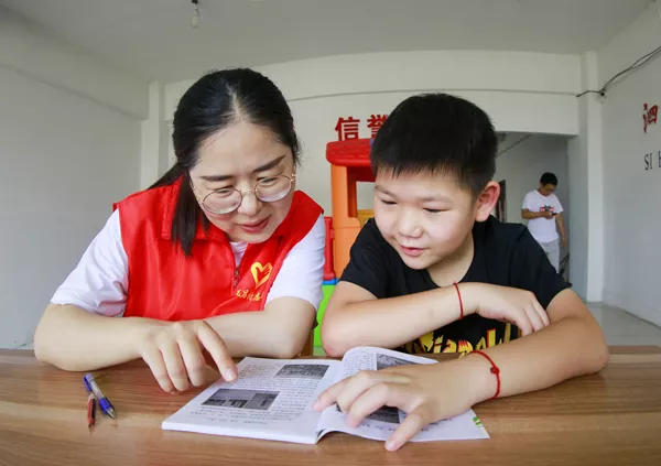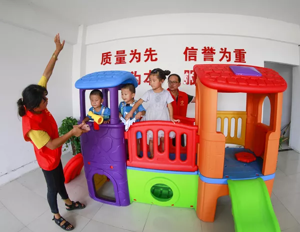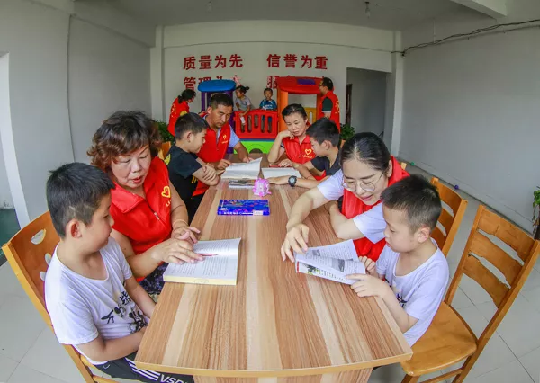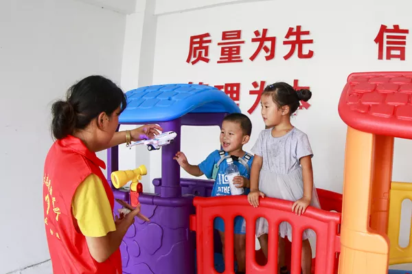 7月27日上午,泗洪县曹庙乡瓦庙村工业园区创博纺织有限公司二楼传出朗朗读书声。曹庙乡组织的党员志愿者服务队正在这里举办暑期少儿伴读活动,一群天真烂漫的孩子,也在新建的儿童游乐园快乐的玩耍着。