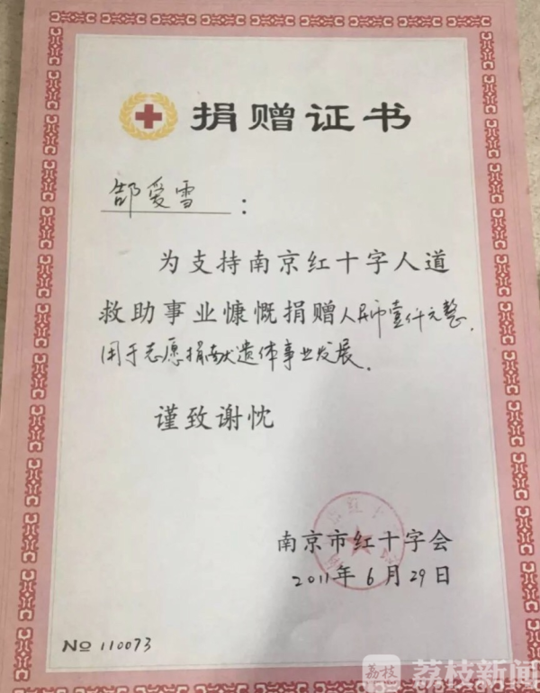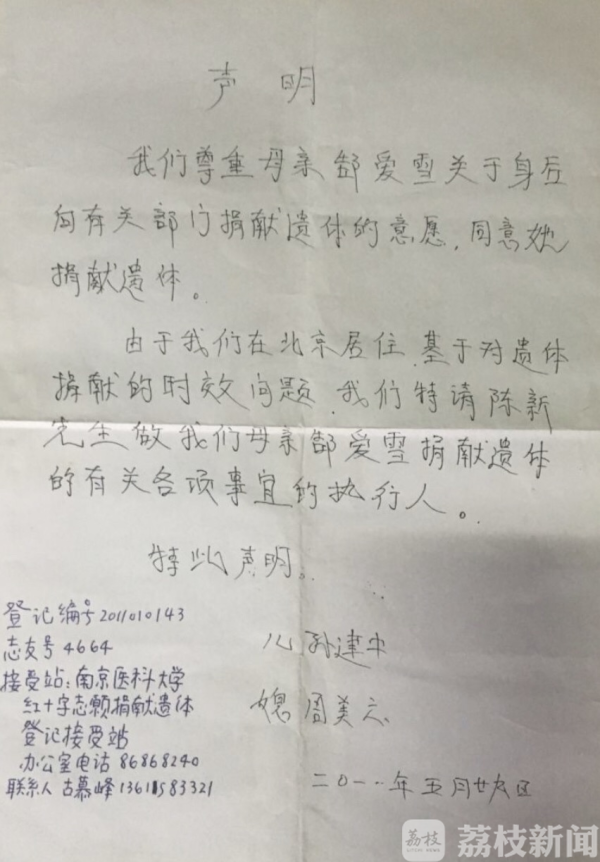 2011年,远在北京的孙先生写了一份声明,委托在南京的郜老师的世侄陈先生做母亲遗体捐赠各项事宜的执行人,家里人一致支持郜老师的决定。