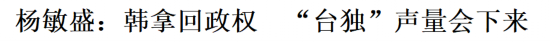 杨敏盛表示,韩国瑜对于两岸的方向很清楚,那就是不管谁执政,两岸最重要的原则就是要“和平”。韩国瑜称两岸同属“一中”,这是没有争议的,但在此基础上,国民党应该更进一步,充分向大陆反映台湾民众的诉求和主张,这样两岸才可以进行更深层次的协商。