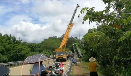 7月30日11时,坠河客车被吊车打捞出水。视频截图
