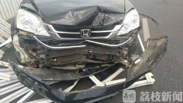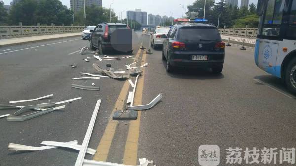 今天(7月30日)中午12点50分左右,南京市公安局特警(巡警)支队民警巡逻经过三汊河大桥时,发现一辆轿车停在桥面正中双黄线上,车头部位受损严重,汽车零部件散落一地。双黄线上用来区隔双向车道的护栏,已经有数十米被撞倒在地,大多变形弯曲。