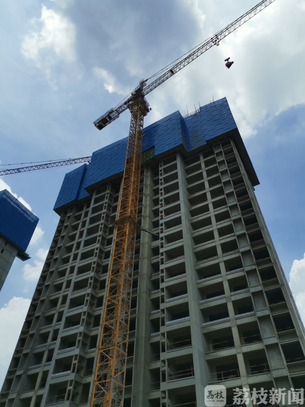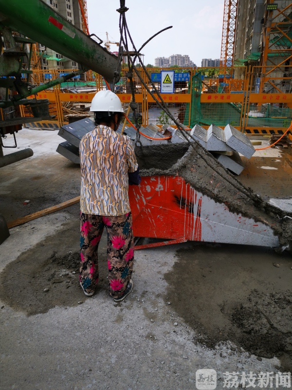 中午12点是一天中气温最高的时段,按照规定,在这一时段内工地是不能进行施工的,但在栖霞区燕子矶的一处工地,仍然在进行混凝土施工作业。这处工地是中海燕子矶听潮项目,正在建设商品房,施工单位为江苏省苏中建设集团股份有限公司。现场施工人员说,因为工期很紧,只能在中午加班。“刚才休息了一会,上面还有四个人在干活。”施工人员说。
