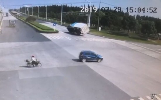 太仓市交警大队提供的监控视频显示,7月29日15时4分许,太仓市浮桥镇滨江大道碧云路路口,一辆重型厢式货车在路口转弯过程中侧翻,事故未波及周围车辆和行人。