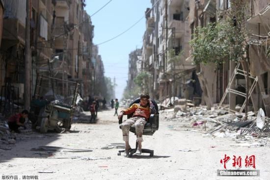 图为2018年4月16日,坐在废墟中的一个叙利亚孩子。