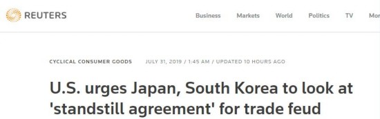 路透社30日报道称,一名美国高级官员当天告诉记者,美国敦促韩国和日本就外交争端签署一项“暂停协议”,为两国进一步谈判争取时间。路透社还称,这名官员表示,华盛顿正试图在这场争端中提供帮助,并表示美国国务卿蓬佩奥预计将于8月1日在曼谷举行的地区性会议上,与日本和韩国外长会面。