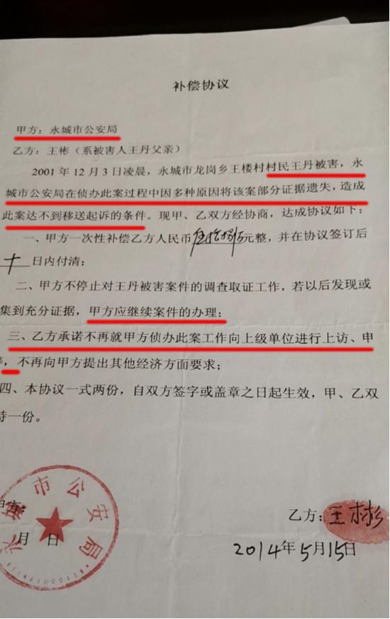 “2014年5月,永城市公安局要我签署一份协议,补偿58万元,要我承诺不要再向上级申诉,他们也承诺不停止案件的侦办、调查取证。”