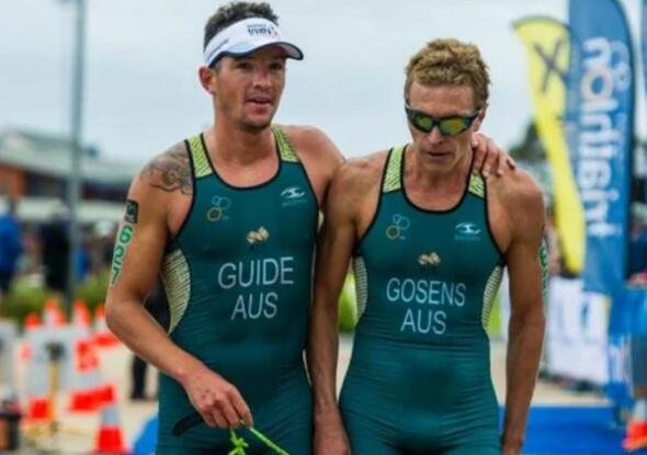 斯蒂芬·汤普森(图左)担任视障铁人三项选手的向导(《悉尼先驱晨报》)