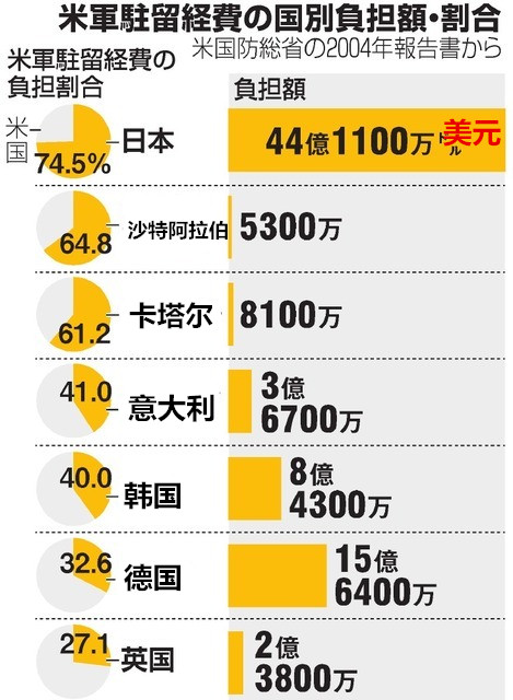 美国向各国收取的驻军费对比。(日本《朝日新闻》)