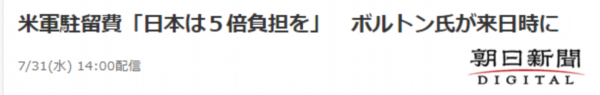美国对日本却没有这么“体贴”。博尔顿于7月21日、22日访日,并同日本外相河野太郎、日本国安局长谷内正太郎举行会谈。《朝日新闻》采访美国政府相关人士后获悉,博尔顿借访日之机,向日本提出了“涨价”的要求。