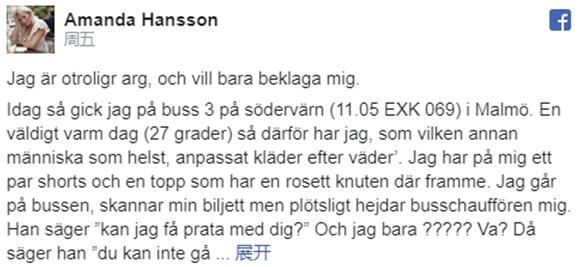 据“今日俄罗斯”(RT)网站30日报道,这名女子名叫阿曼达.汉森(Amanda Hansson),今年19岁。由于天气炎热,汉森一天穿着短裤和吊带背心上街, 然后登上了一辆公交车。