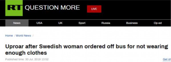 据RT报道,公交公司表示,该公司并没有禁止女性穿某些衣服的规定,并对汉森受到的“错误对待”表示遗憾。