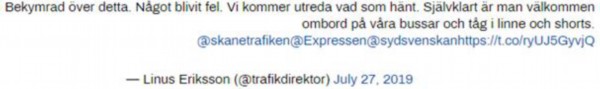当地交通部门负责人莱纳斯.埃里克森(Linus Erixon)旋即展开公关——“出了一些问题,”他在推特上写道。“当然欢迎人们穿着短裤和迷你裙登上我们的公交车和火车。” ↓