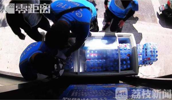 在丹凤街上的“公益补给站”,爱心冰柜内准备了数量充足的矿泉水,不一会儿,一名送快件的小哥经过这里,他停下车,开心地拿了一瓶水。