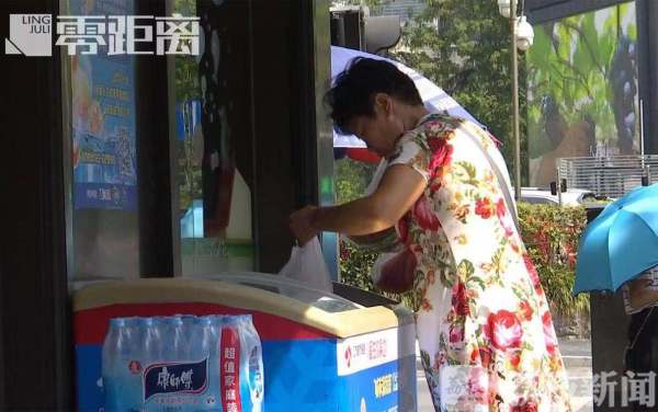 户外的气温在逐渐升高,中午11点左右,室外温度已经超过37度。来取水的户外工作者也越来越多,快递员、外卖小哥、保洁员……喝上两口水又都匆匆投入到工作中去。一名黑衣女子走到冰柜前,看了两眼,径直走进了超市,出来时,手里多了一袋面包,小心翼翼地放在了冰柜中,没有留下姓名就离开了。几分钟后,又有一名年轻小伙走到冰柜前,放入两瓶饮料,也匆匆离开。还有一位女士拎着几袋切好的西瓜,放进冰柜,这位女士是马路对面西瓜摊的摊主。