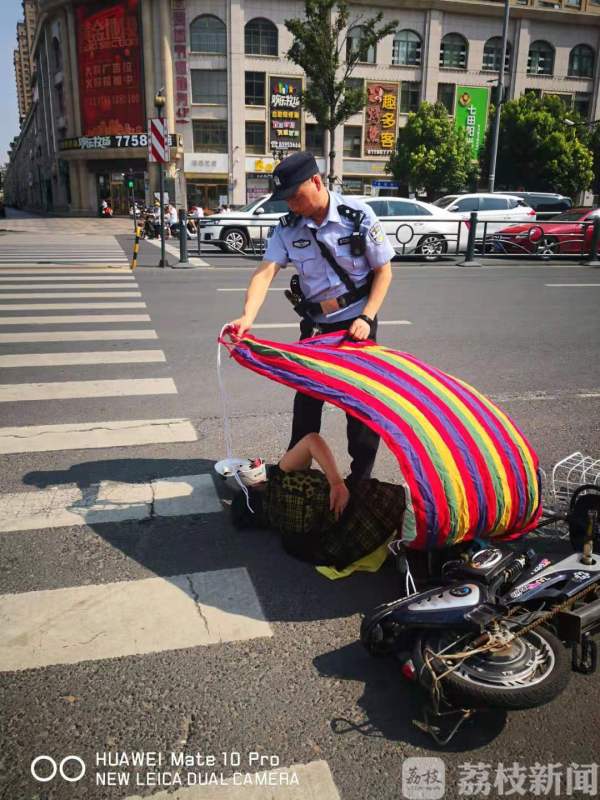 当时室外温度在32℃以上,地面温度更高,为了防止伤者出现中暑等意外,王凯从附近商店借来遮阳布,民警叶旺森拉着遮阳布为受伤女子遮挡灼热的阳光。