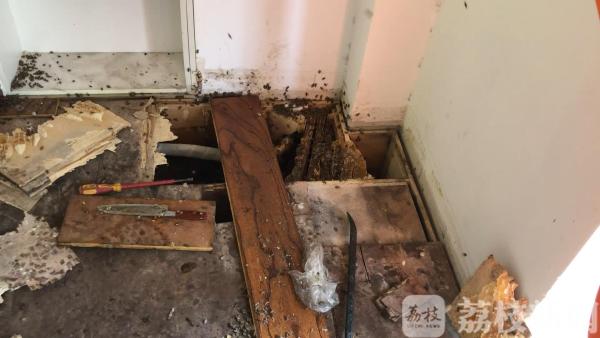 房主说,6月份的时候发现家中地板下有蜜蜂爬出,消防也来查看了,由于要破坏地板就没撬开,最近想了办法,把空调洞堵上。谁知这两天蜜蜂飞不出去了,就从地板涌出,只好再次求助消防帮忙清除。