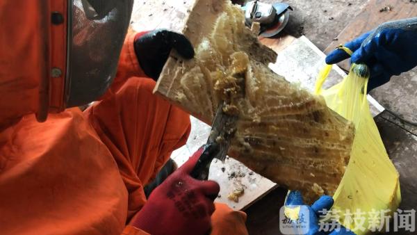 消防员利用撬棍等工具将地板一点点撬开发现,靠墙地板下的隔段有一个巨大的蜜蜂巢。蜜蜂应该是从空调洞飞进来,钻到地板隔段内筑巢的。两个隔段大概一平方米的面积,里面有大量蜜蜂不断涌出。一名消防员将蜂巢一点点拿出,经过半个多小时的清理,足足清理出了5袋子、重约30斤的蜂巢和蜂蜜。