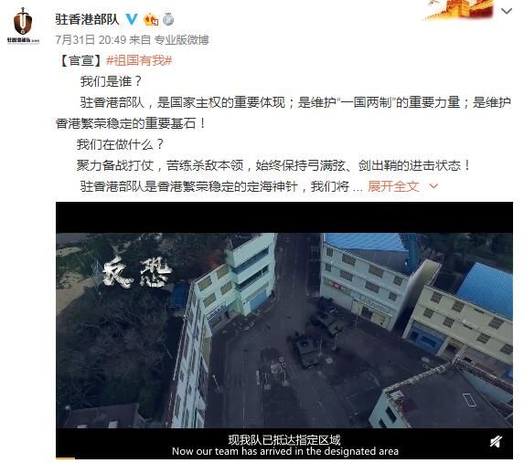 荔枝新闻讯 7月31日,中国人民解放军驻香港部队在其官方微博发布了一则宣传片——《不忘初心 守护香江》。