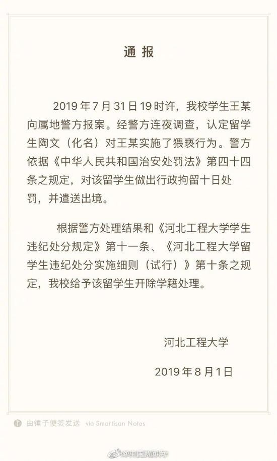 荔枝新闻讯 近日,河北工程大学学生王某报案称,自己遭到一留学生骚扰。@河北工程大学 1日通报称,校方决定给予该留学生开除学籍处理。