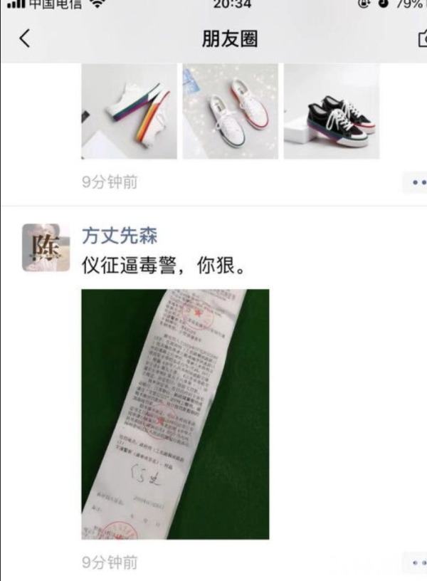 20:25分,陈某将处罚决定书发送到自己的朋友圈,并且配上了侮辱性的语言。后来,陈某的朋友圈内容被人转发到“仪征吧”。