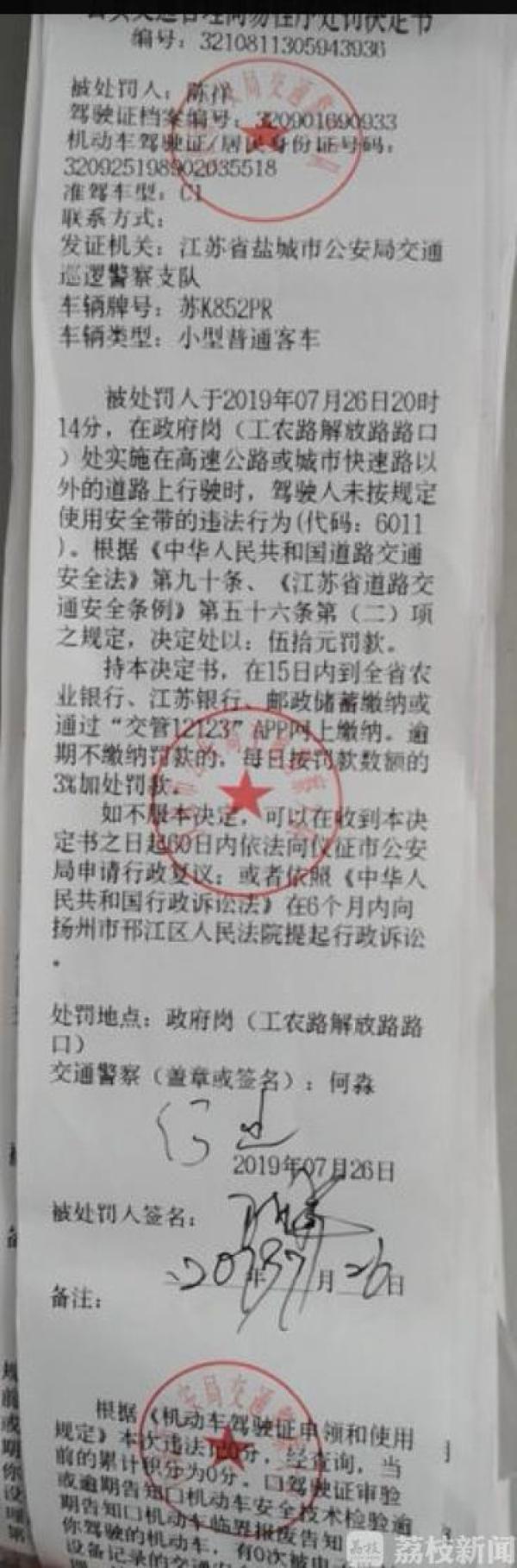 7月26日20:00左右,仪征市交警大队执勤民警何淼在解放东路与工农路交叉路口执勤过程中,发现陈某未系安全带,于是,根据《中华人民共和国道路交通安全法》第90条和《江苏省道路交通条例》第56条第2项之规定处以50元罚款、不记分,陈某现场没有提出任何异议,同时,在处罚决定书上签了字。