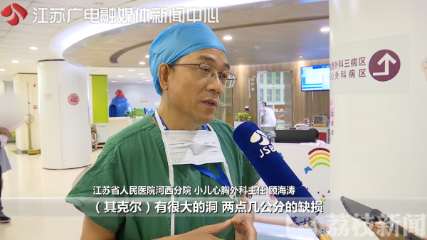 今年五月,其克尔突发重感冒,家里人带他去新疆当地的医院做详细检查时,才发现他有先天性心脏病,心室间隔缺损巨大,伴有严重的肺动脉高压。江苏省人民医院河西分院小儿胸外科主任顾海涛告诉荔枝新闻记者,正常人左右两个心室完全分开,其克尔有两点几公分的缺损,另外,正常动脉导管是每个胎儿都有的生命通道,出生以后就会自动闭合,这个孩子也没有闭合。