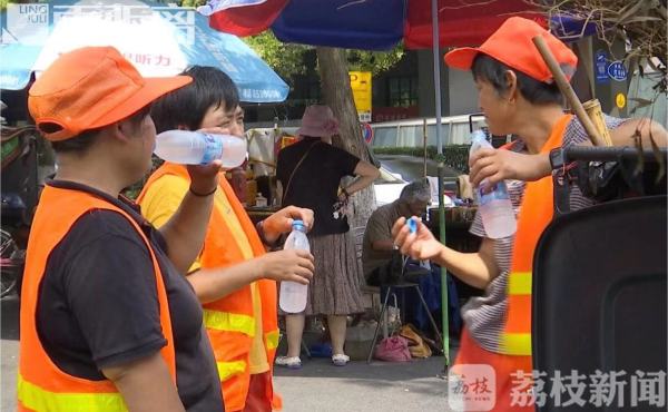 环卫工龚女士说:“大家都知道补给站,同事们都来拿水喝。”