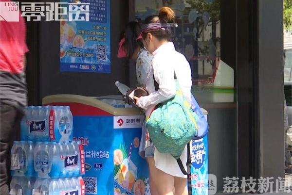 一对母女也在“公益补给站”停下了脚步,她们走进超市,离开时,往冰柜里加了几瓶矿泉水。
