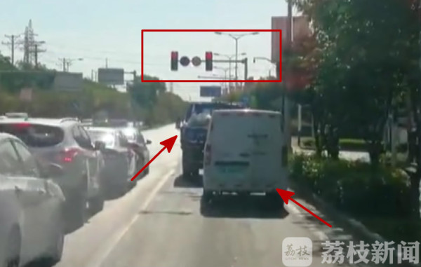 听到消防车的警笛声,最前方一辆蓝色大卡车当机立断,不顾前方直行车道的红灯,向左转横停在中间直行车道。后方一辆白色汽车也默契地向右转,让出了一条生命通道。道路清空以后,消防车得以顺利地右转通行。