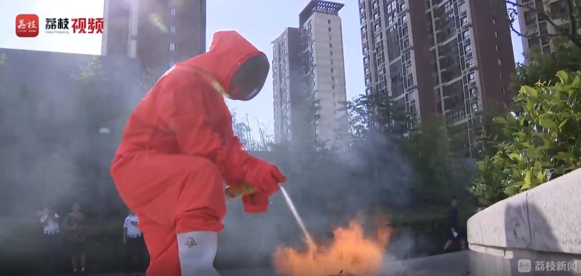 7月22日下午,常州市武进区消防大队府东路中队接到两起马蜂窝警情,消防员到达现场后,发现在草丛中隐藏着一个足球大的马蜂窝。消防员唐铨泽穿戴好密不透风的防蜂服,点燃灭害灵喷雾剂,对马蜂窝进行火攻。在摘除马蜂窝后,唐铨泽又用杀虫剂对马蜂筑巢的地方进行地毯式喷射,防止马蜂再次筑巢,影响居民的日常生活。等处理结束,唐铨泽将防蜂服脱下,已是热得浑身湿透。