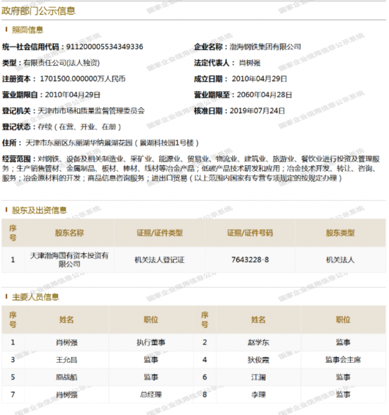 工商资料显示,渤海钢铁集团工商信息已于近日完成变更,严泽生等人已从主要人员中移除,法人代表、执行董事、总经理现改为肖树强。
