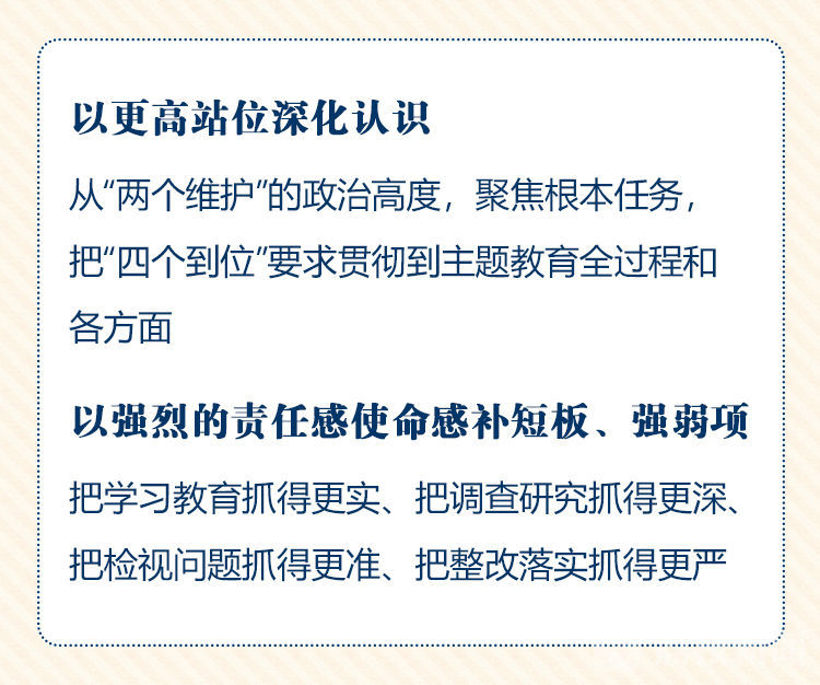 会议指出,习近平总书记多次就主题教育作出重要指示,前不久在内蒙古考察并指导开展主题教育时又明确提出了抓思想认识、抓检视问题、抓整改落实、抓组织领导“四个到位”的重大要求,指向明确、针对性强,为我们扎实推进主题教育提供了重要遵循。要以更高站位深化认识,坚决用习近平总书记重要指示精神指导主题教育深入开展。从“两个维护”的政治高度,聚焦根本任务,把“四个到位”要求贯彻到主题教育全过程和各方面,确保总书记重要指示精神在我省落地见效。以对标找差的鲜明态度,清醒认识我省主题教育存在的差距和不足,以强烈的责任感使命感补短板、强弱项,把主题教育不断引向深入。从知行合一的实践角度,把学习教育抓得更实、把调查研究抓得更深、把检视问题抓得更准、把整改落实抓得更严,以各项工作的高标准推动实现主题教育的高质量。
