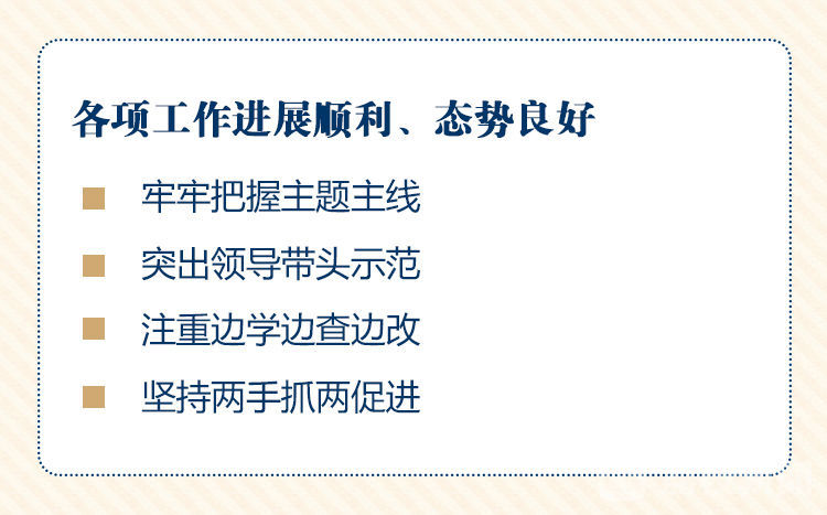 会议肯定了我省主题教育取得的阶段性成效。会议认为,主题教育启动以来,我省第一批参加单位认真贯彻中央和省委部署要求,牢牢把握主题主线,突出领导带头示范,注重边学边查边改,坚持两手抓两促进,精心组织、扎实推进,各项工作进展顺利、态势良好。但同时也存在一些不容忽视的问题,要高度重视,采取有效措施切实加以解决。
