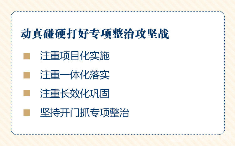 会议强调,要以更强担当真改实改,拿出自我革命的勇气,动真碰硬打好专项整治攻坚战。要注重项目化实施,突出落细落小,逐项明确任务书、时间表,实施挂图作战,一项一项整改、一项一项验收、一项一项销号,坚决杜绝“表面整改”“虚假整改”“敷衍整改”。要注重一体化落实,省委主题教育办公室专项整治工作小组要抓好整体谋划、组织推进和督促检查,牵头部门要加强对专项整治的统筹协调和推进落实,各参与单位要按照职责分工主动配合、抓好落实。要注重长效化巩固,既出重拳“当下改”,又建制度“长久立”,着力从政策和制度层面解决问题,该完善的机制抓紧完善,该堵塞的漏洞坚决堵塞,形成常态长效、防止反弹回潮。要坚持开门抓专项整治,请群众参与、让群众评判、受群众监督,使群众真正感受到主题教育带来的新变化。