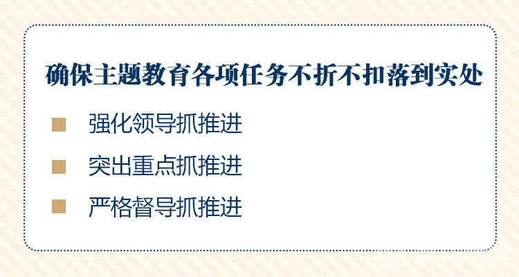会议强调,要以更严要求压紧责任,一鼓作气、持续发力,确保主题教育各项任务不折不扣落到实处。要强化领导抓推进,第一批参加单位党组织特别是主要负责人要对本单位主题教育开展情况进行一次“盘点”,看一看整体进展怎么样,查一查差距短板在哪里,想一想如何深入推进。省委主题教育办要超前谋划好第二批主题教育,注重两批次的有机衔接。要突出重点抓推进,近期重点抓好党史、新中国史的学习研讨,组织开好对照党章党规找差距专题会议,及早做好专题民主生活会准备工作。要严格督导抓推进,省委各巡回指导组要敢于当“包公”、唱“黑脸”,严格把好“规定动作关”“质量标准关”“工作结合关”,及时发现问题、时时进行纠偏,确保主题教育不虚不空、不走过场。